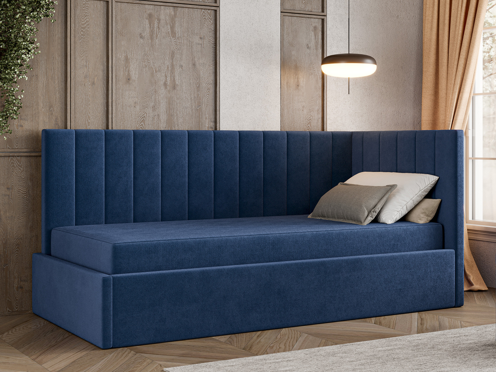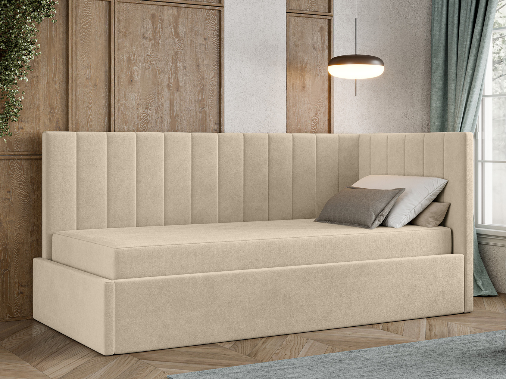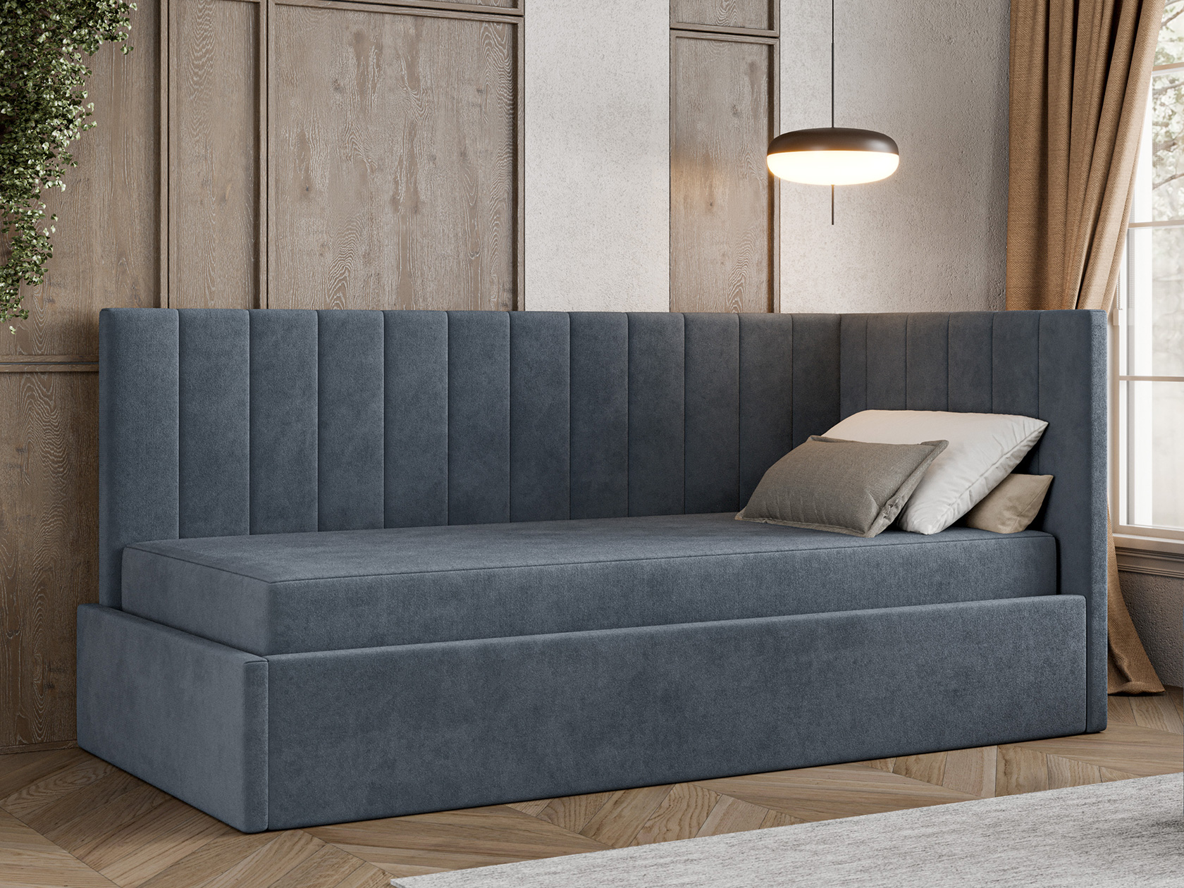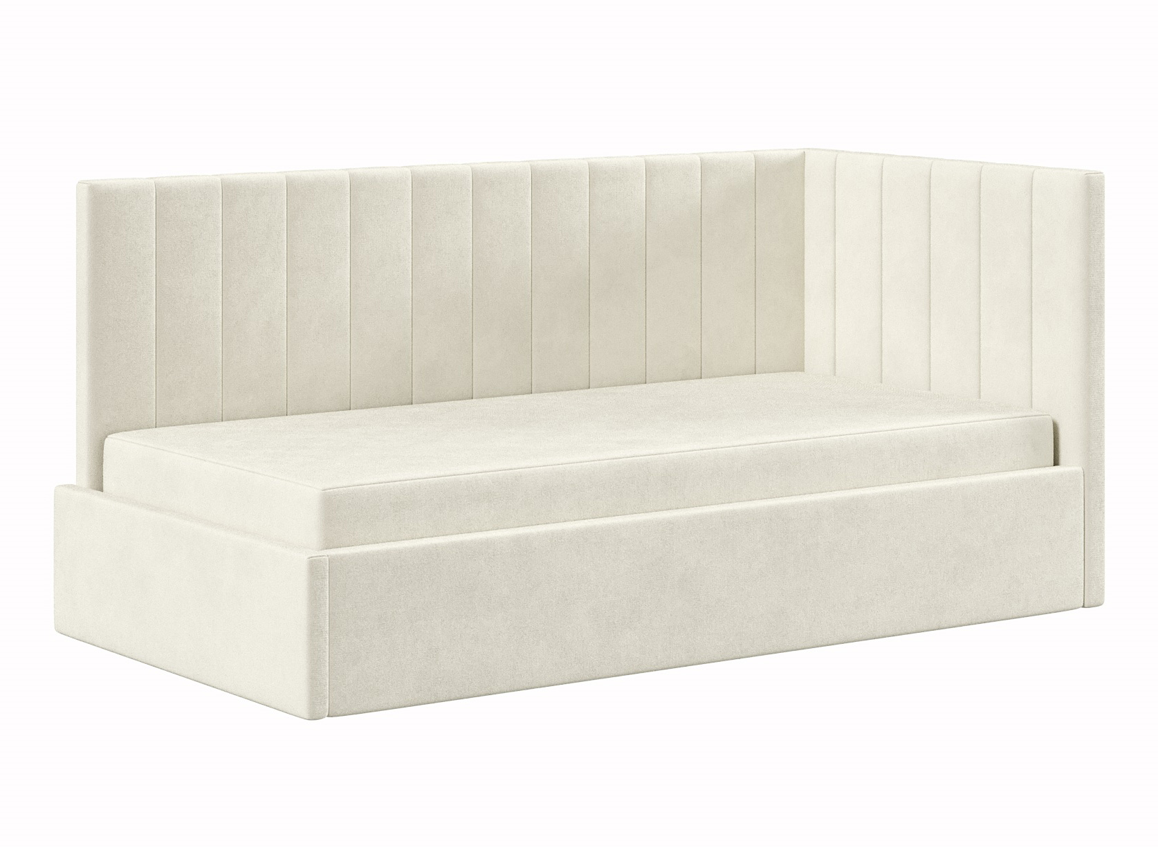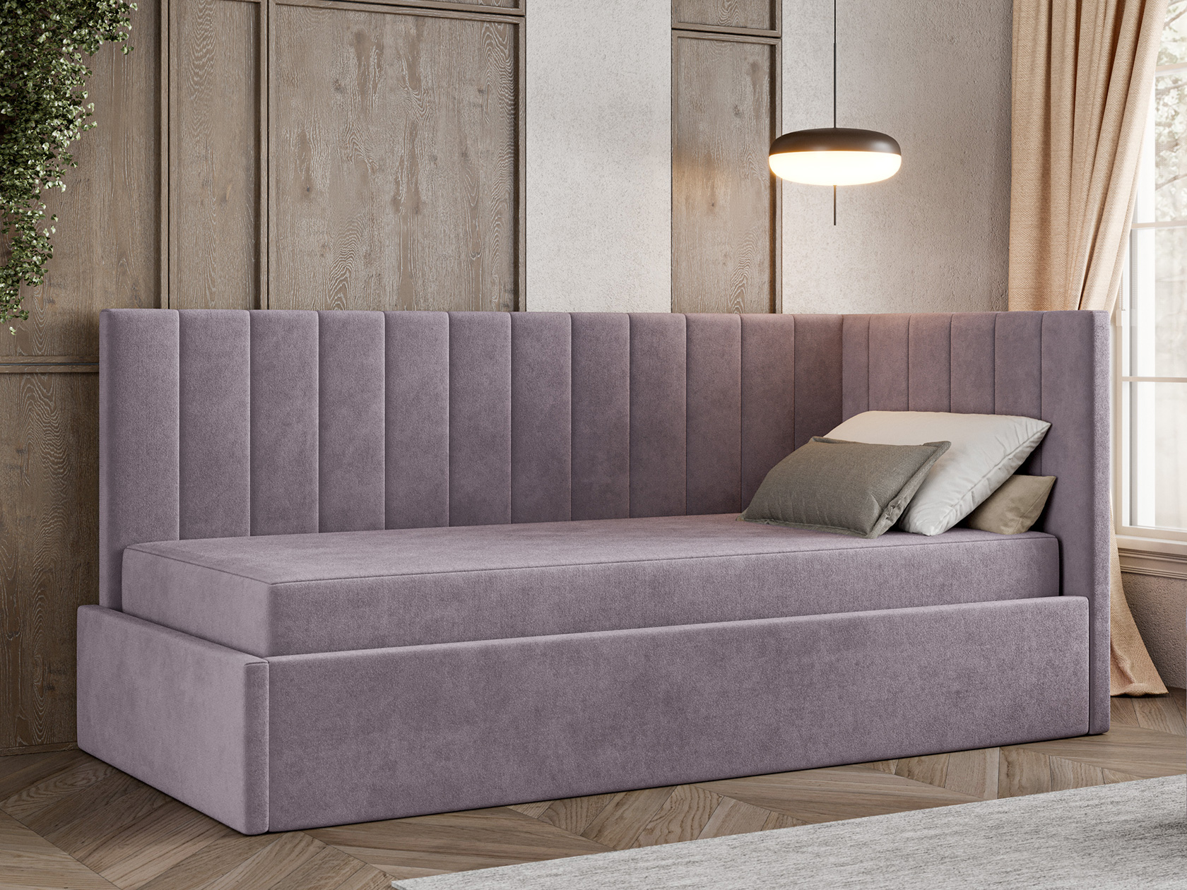 Днем модель послужит уютным местом для отдыха, а на время сна заменит полноценную кровать. Подъемный механизм открывает быстрый доступ к бельевому коробу. Спинка и боковина декорированы вертикальной стежкой, которая подчеркивает лаконичный силуэт.